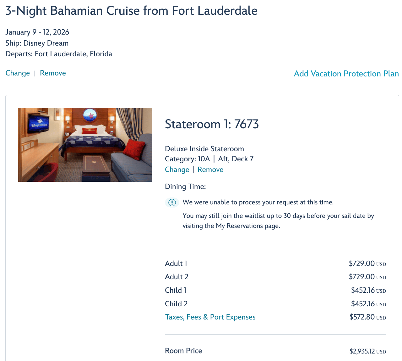 The rate for a 3-Night Cruise on Disney Cruise Line's Disney Dream from January 9-12, 2026 for 2 Adults and 2 Children is currently $2,935.12 for a Deluxe Inside Stateroom. This sails out of Fort Lauderdale.